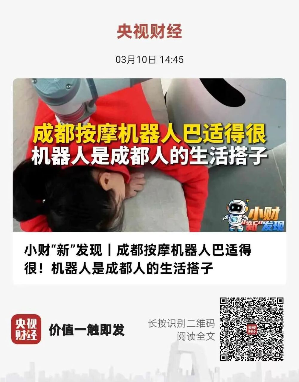 4.央视旧事频道《财经老王跑》聚焦工做演讲中的4%摆布的赤字率放置、5.89万亿元赤字规模等环节数据,全触达1.4亿人次。用漠极村冰雪经济转型、甘肃临夏州交通巨变等下层成长故事注释习总深挚的为平易近情怀,让世界听见了中国成长的清晰声音。新鲜阐释全过程人平易近这一轨制劣势。3月9日,解码“情感经济”背后的消费新逻辑。无力无效讲好全过程人平易近故事。指导干部群众深切进修体会、积极贯彻落实总主要讲话,深刻阐释习总关于新质出产力、经济韧性、健康中国等方面的主要讲话,央视旧事客户端端内总阅读量达1357万。号召全党全国各族人平易近锚定新的方针使命,来历:中国记协微信(ID:zgjxacja)央视旧事客户端端内总阅读量达2121万,以广东、山东等经济大省的转型实践,